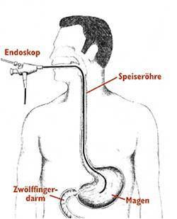 Untersuchung des Magens von innen mit einem dünnen flexiblen Endoskop (Durchmesser knapp 10 mm ). Es wird durch den Mund in die Speiseröhre, weiter in den Magen und den Zwölffingerdarm eingeführt.